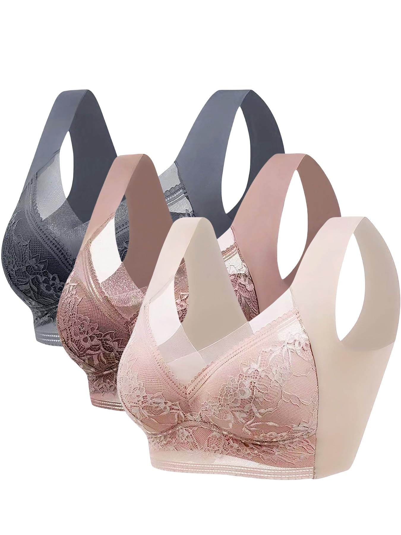 3-Pack Women’s Wireless Lace Bras – Floral Contrast Full-Coverage Bralettes with Breathable Fabric, Comfortable Everyday Support Set