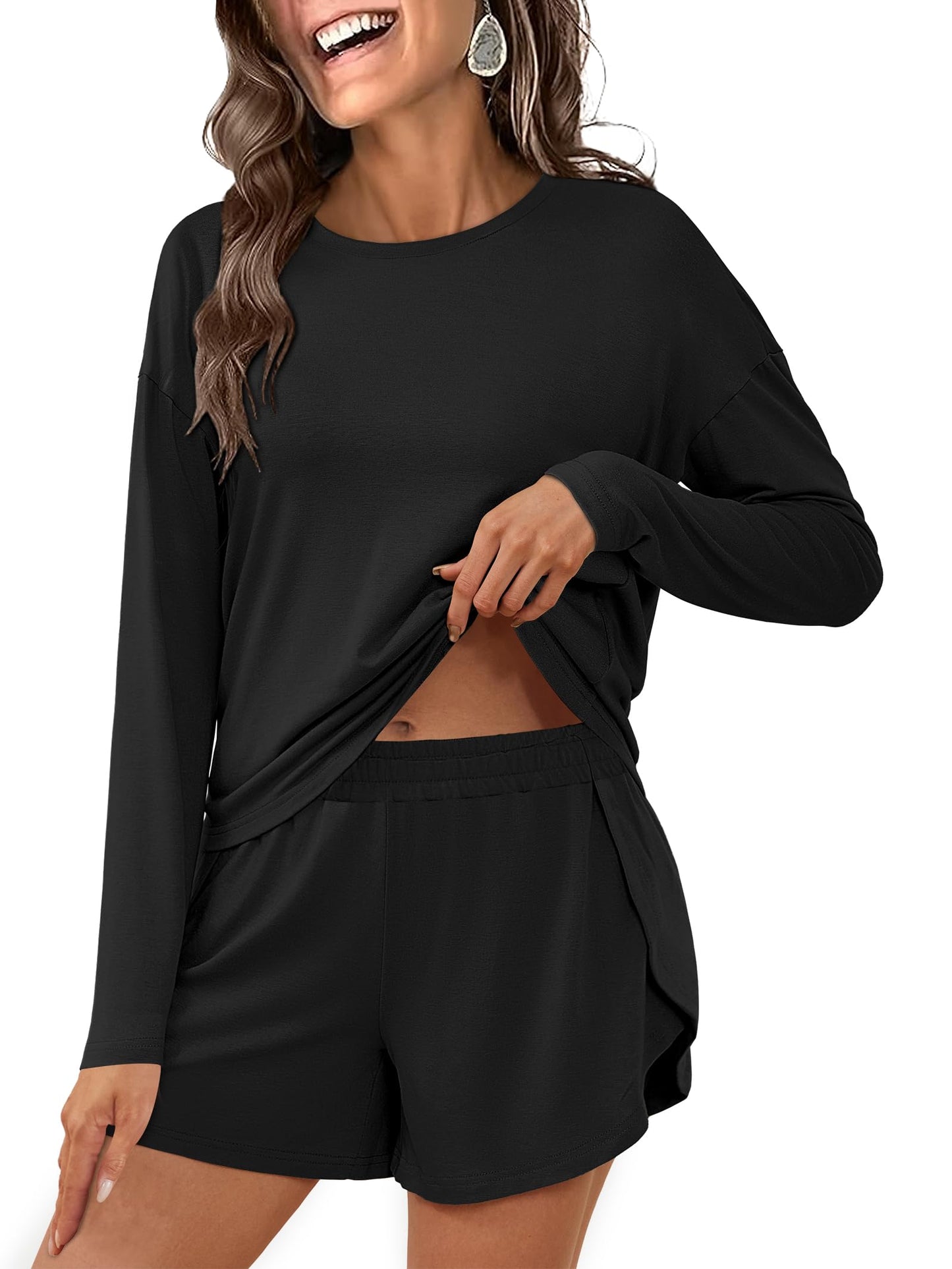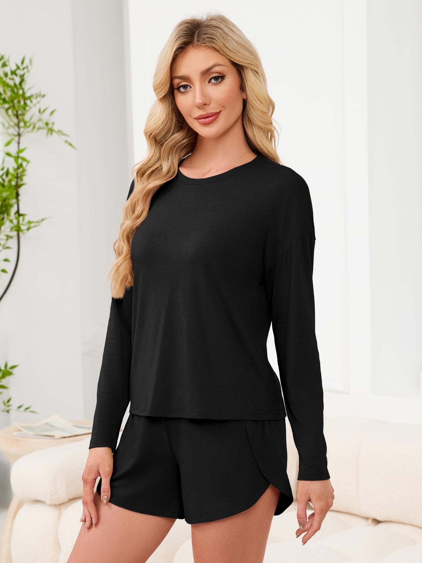 • Features - This womens pajama sets liberating side-cut silhouettes cascade along the leg, dissolving constriction with every step for frictionless freedom.Crew neck, Long sleeve, Elastic Waist Short Pants. This women's pajama set is perfect for daily wear, lounging at home, preppy on school,outside on street, outdoor and vacation.