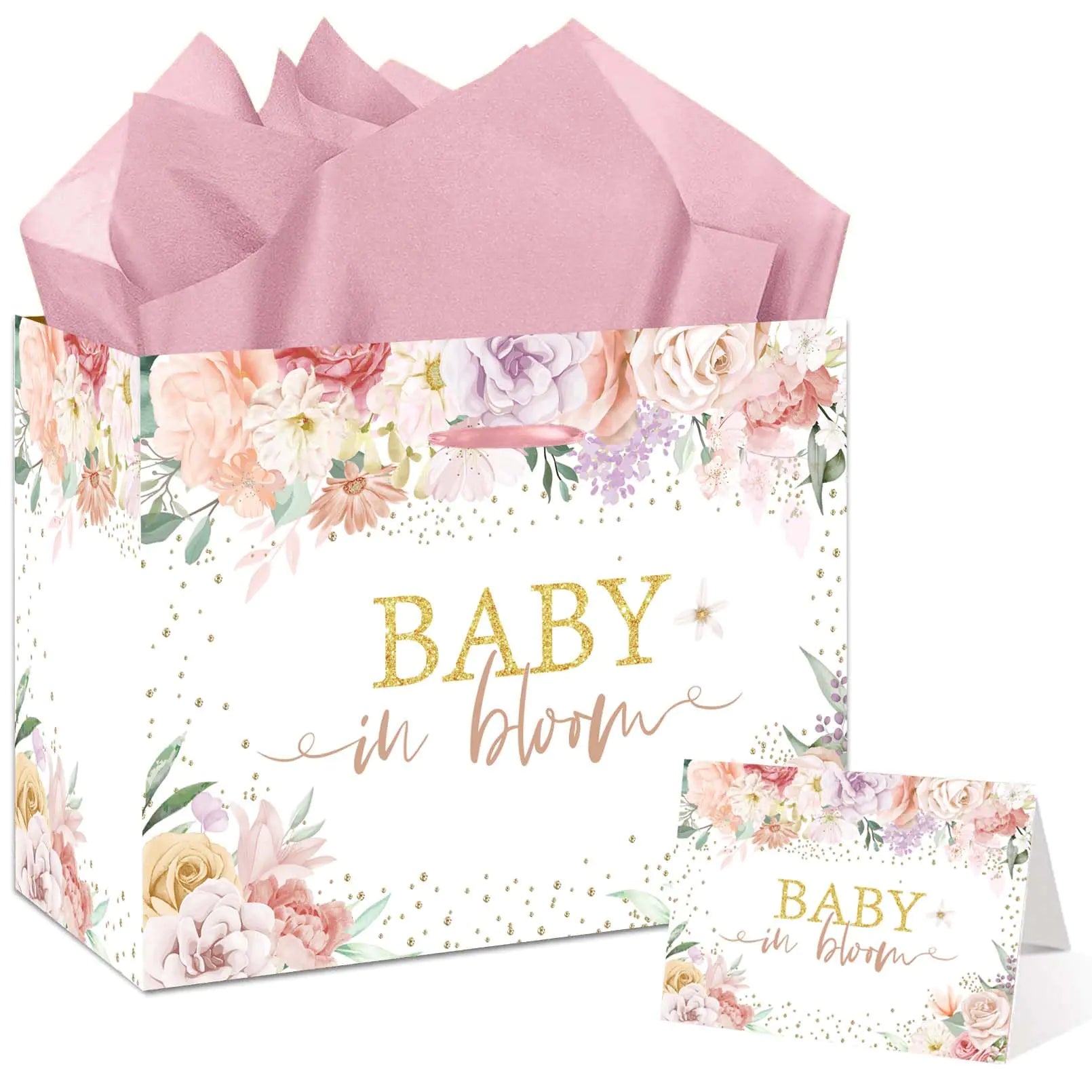 Baby Gift Bag Large Floral Baby in Bloom Gift Bag with Tissue Paper and Card with Envelope for Baby Girl Gifts Birthday Kids – Pink Baby Shower Wrapping Paper for Baby Shower Party Decorations