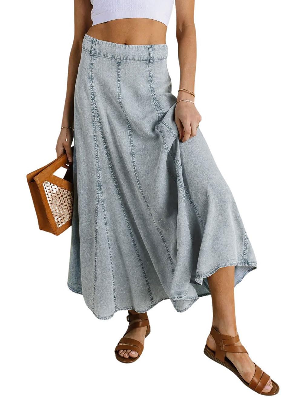 Women Vintage Long Denim Skirt Flowy Big Hem Slouchy Washed Jean Skirt; Slouchy fit flowy maxi denim skirt/ Vintage long denim skirt/ Stretchy denim long skirt; Highlights: Washed denim long skirt, vintage western skirt for women; Vertical stitching patchwork denim skirt, create a elongating heights effects; Flowy big hem long jean skirt, offer a touch of free; Design: This lightweight denim long skirt is crafted from mid waist skirt, back zipper closure, stretchable fabric, feminine a-line silhouette, flared big hem, suitable for all kinds of figures, around mid-calf length; Color-Blue, and Light Blue; Versatile Long Jean Skirt: This retro patchwork denim skirt is fitted for women causal long denim skirt, fashion y2k street wear flowy jean skirt, weekend party maxi denim skirt, causal loose fit work modest a line light jean skirt, vacation full length denim maxi skirt for women, going out long jean skirt outfits for western cowgirl; Size Guide: S=US(4-6), M=US(8-10), L=US(12-14), XL=US(16-18), This causal long denim skirt can be wear with your crop shirt for a y2k style, or wear with your blouse for a causal new look; pair with your sandals or boots for a cottage-core style