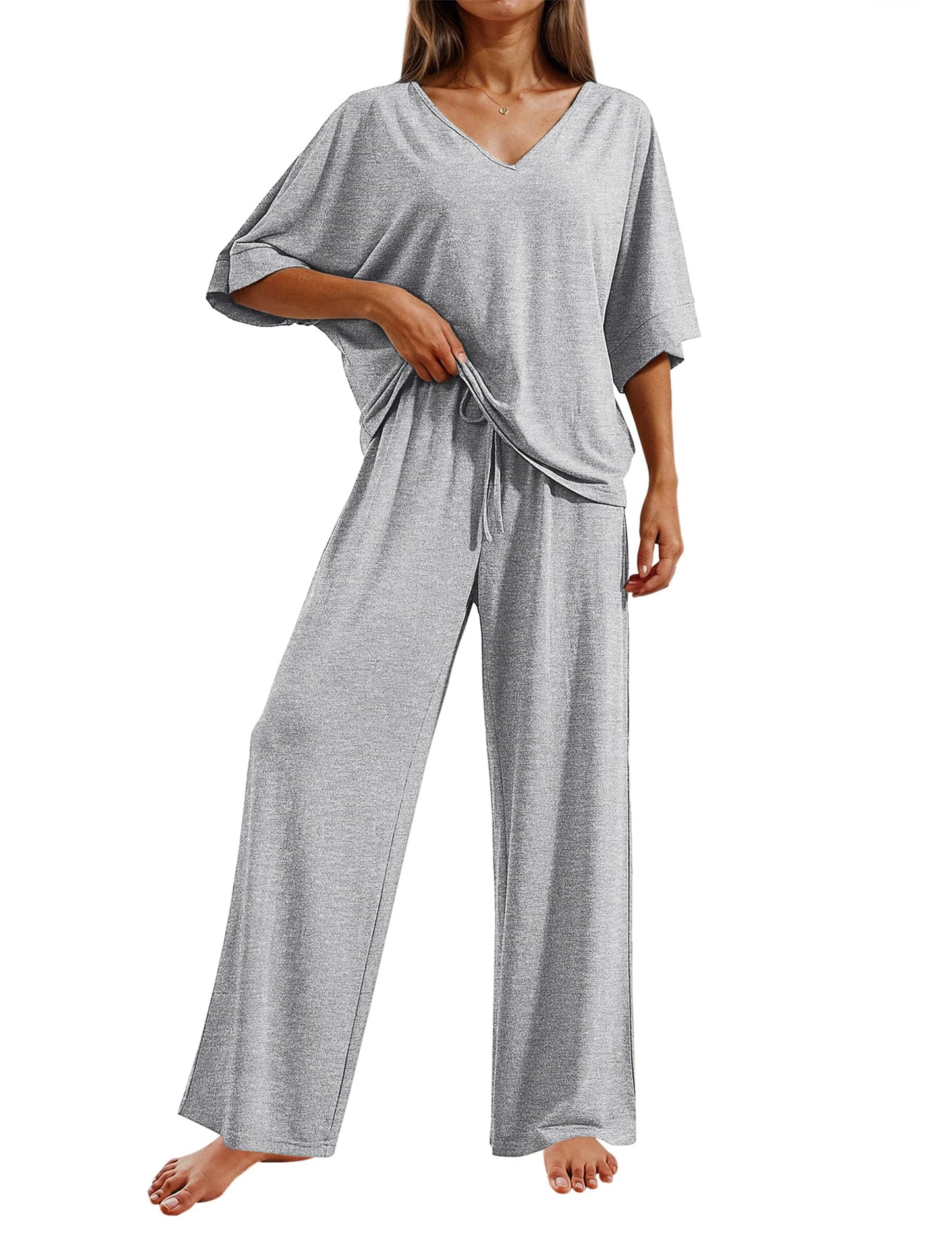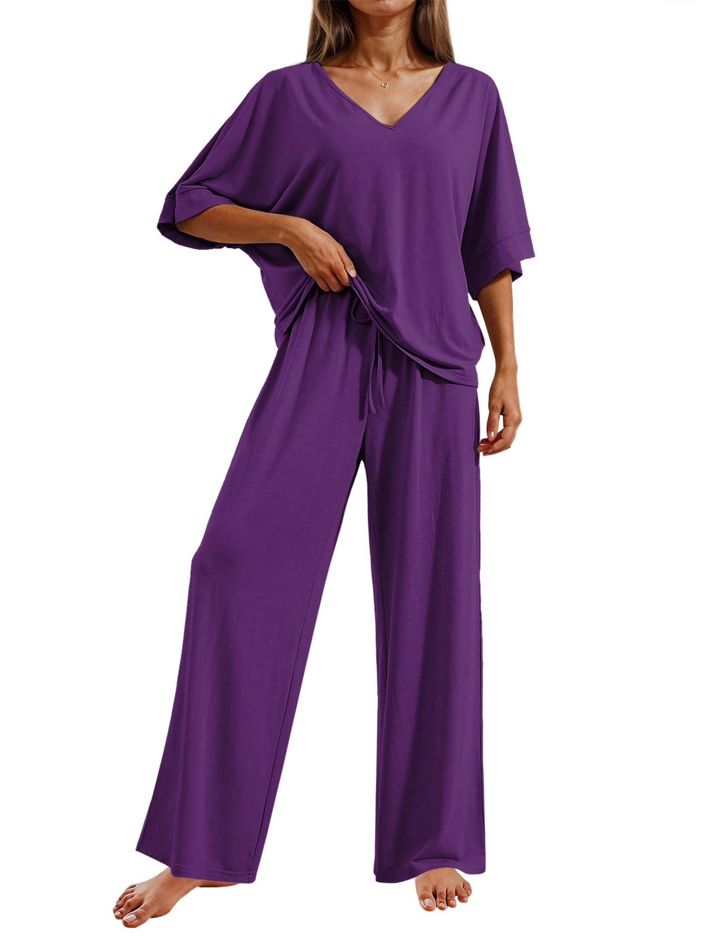Lounge Set for Women/Loungewear for Women/Women Loungewear Sets/Short Sleeve Pajamas Tops for Women/Wide Leg Pjs Pants for Women/Pajamas Sets for Women/Two Piece Pjs Set/Matching Sets for Women/Summer Clothes for Women/V neckullover/Long Pants with Pockets/2 Piece Outfits for Women/Airport Outfits for Women 2025.