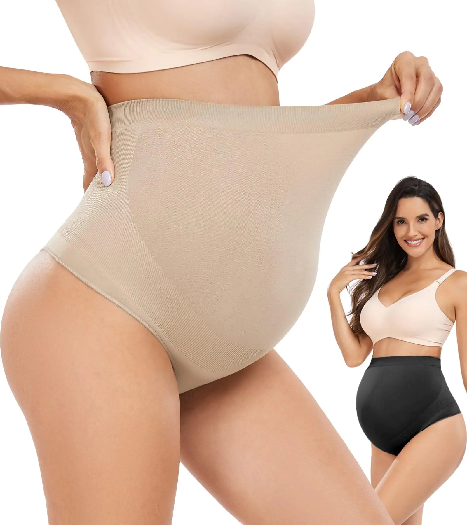 [Ultimate Comfort with Stretch-and-Recovery Knit: Our fabric stretches and recovers for a comfy fit with a belly panel that expands as you grow through pregnancy. Perfect year-round with breathable moisture-wicking properties to keep you cool and dry. Say goodbye to pinching bunching and rolling. Stylish Support for Moms-to-Be: This maternity seamless underwear shapes and supports your growing belly ensuring comfort. Ditch traditional over-bump briefs and embrace our lightweight supportive over-belly thongs. Essential for the first trimester and beyond offering stomach control with a perfect blend of comfort and style. "Perfect Fusion of Support and Sleek Design: High-waisted and seamless this maternity panties offer no lines slim thighs and support for your baby bump. Enjoy a snug lightweight feel all day long whether youre active or just relaxing and whether youre looking for modern maternity wear or fajas para embarazada maternidad." Flattering Fit and Support Post-Pregnancy: Ideal for under-dresses or as plus-size fashion essentials these full-coverage maternity shapewear are smooth and slim while preventing chafing. Designed to be irritation-free with a high-waist fit for comfort during postpartum. Versatile Colors and Sizes: Maternity thongs are available in nude black and white to match your wardrobe preferences. Our panties ensure a perfect fit from sizes S to XXL making it easy to find the right size for your post-pregnancy body shaping needs.]