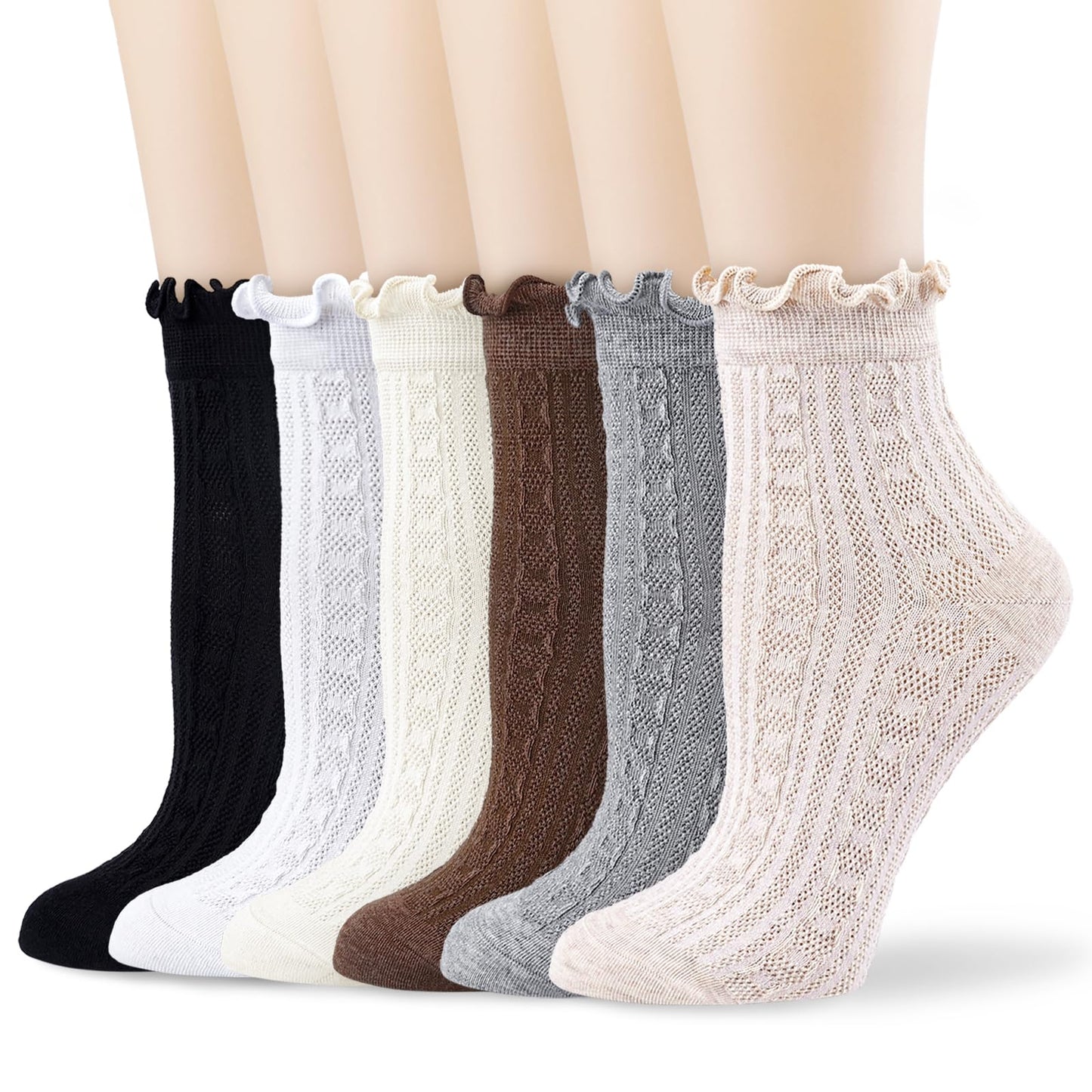 Womens Crew Socks Ruffled Cotton Breathable- Cute Knit- 6 Pack