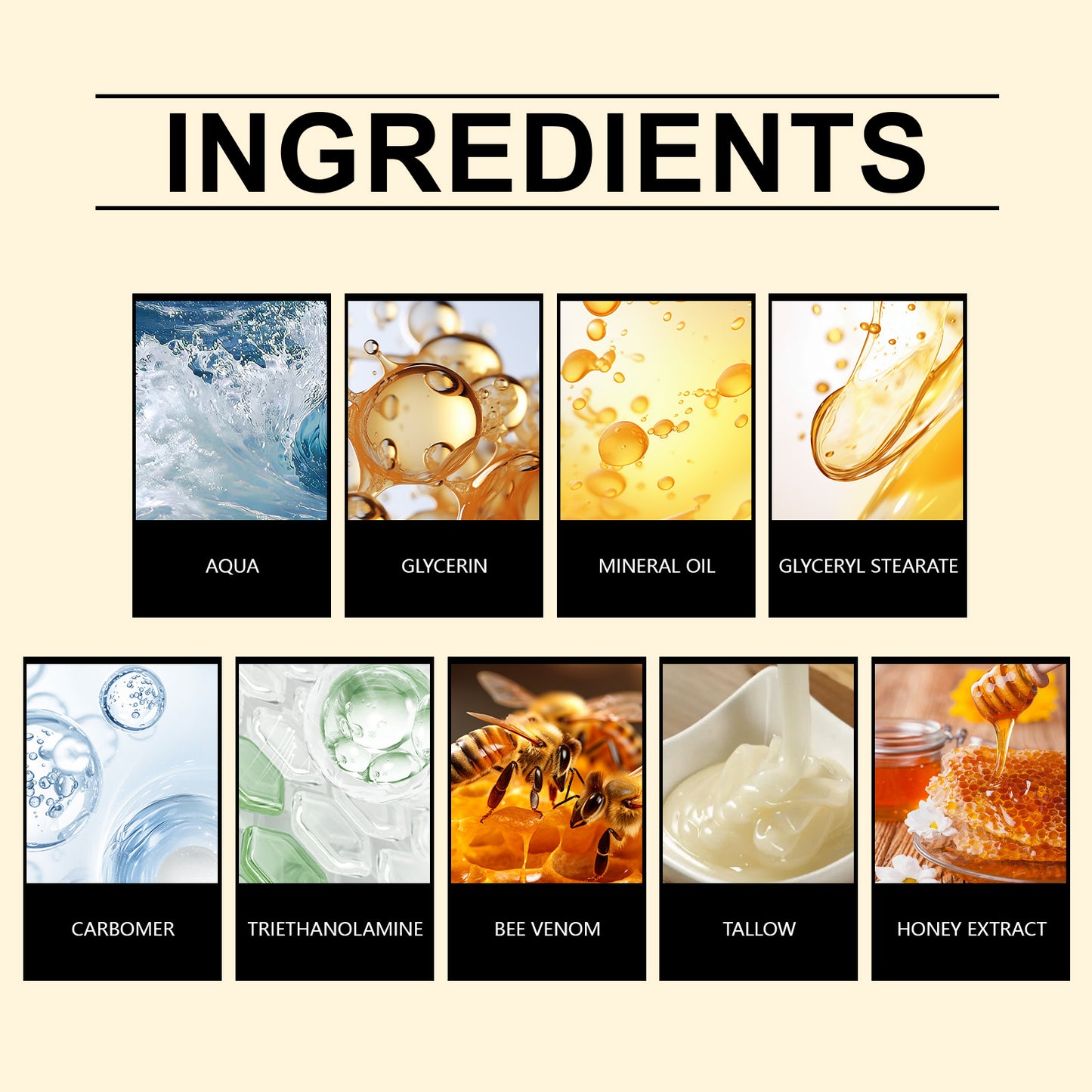 Our honey moisturizer contains tallow, honey extract, bee venom. It provides a deep moisturizing effect that helps the skin lock in moisture and stay moisturized for the long term. The way to use it is simple: 1. Clean the face and body and keep it dry. 2. Apply appropriate amount to face and body. 3. Gently massage until absorbed. Helps improve skin elasticity, reduces the appearance of fine lines and wrinkles, and makes skin look younger.